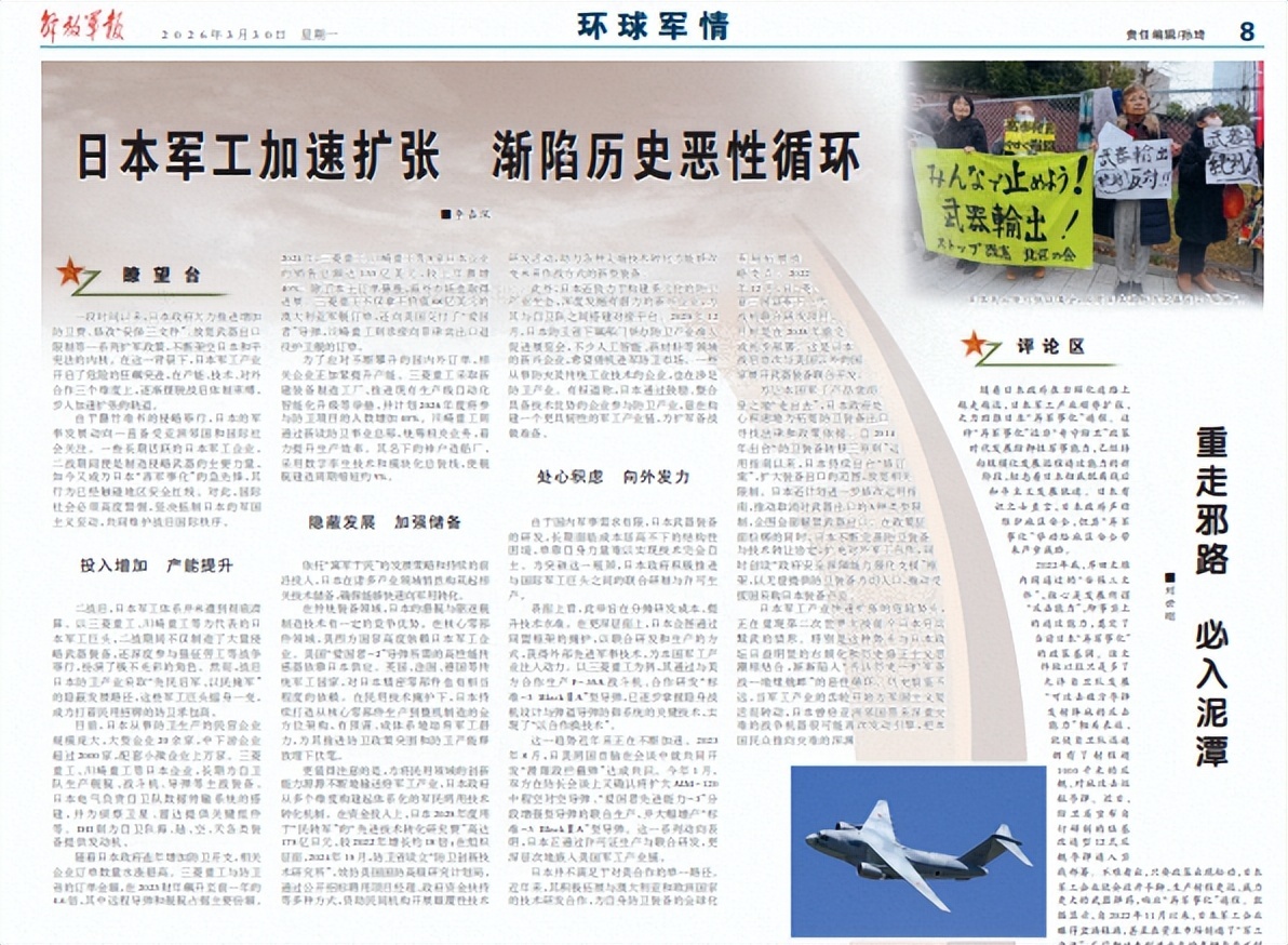 北京时间3月30日,《解放军报》发表了一篇题为《日本军工加速扩张 渐陷历史恶性循环》的评论文章。